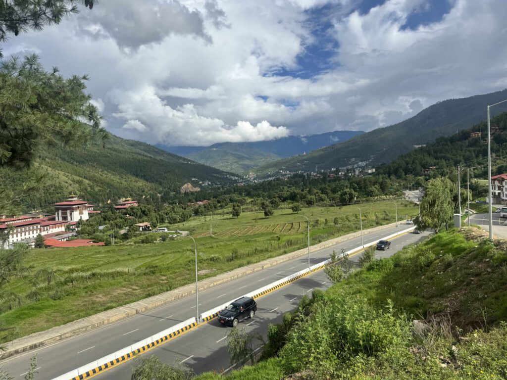 Von Paro aus fuhren wir 45 Kilometer nach Thimphu, Bhutans Hauptstadt, die auf einer Höhe von 2.334 Metern liegt. Unterwegs schlängeln sich die Straßen durch Kiefernwälder und Flusspfade und bieten bei jeder Kurve malerische Ausblicke.