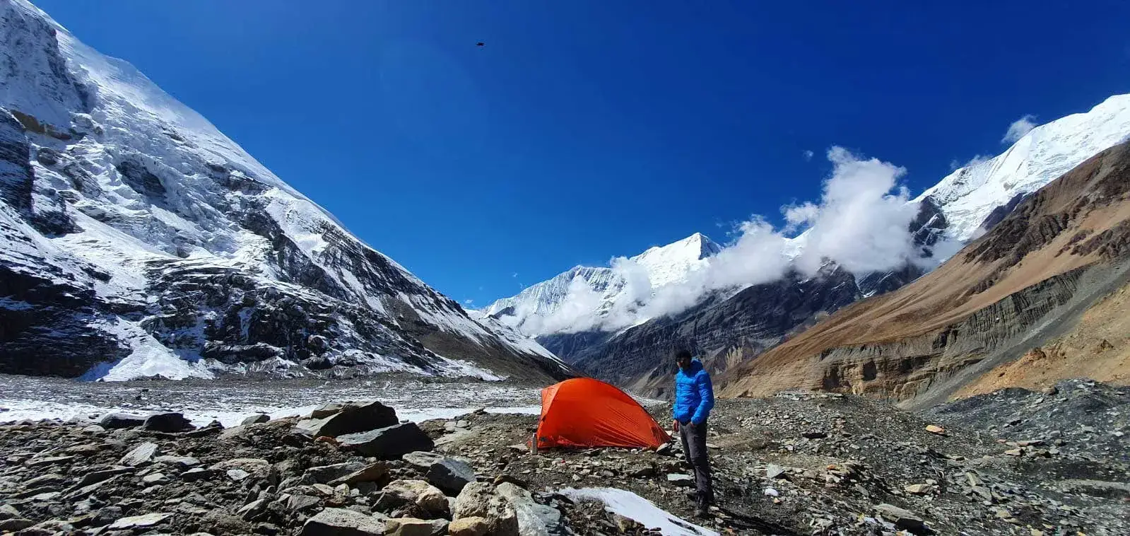 Nach dem Aufwachen an der frischen Luft frühstücken wir vor unserer vierstündigen Wanderung zum italienischen Basislager. Wir haben einen herrlichen Blick auf das Dhaulagiri-Gebirge, den Manapathi Peak und den Dhaulagiri II. Wir übernachten im Zelt.